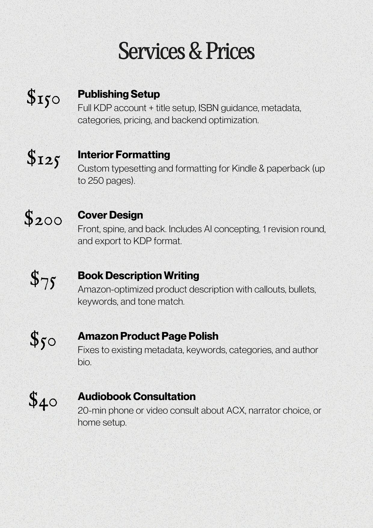For authors ready to self-publish cleanly and professionally. Includes setup, formatting, cover, basic optimization, and 1 consult. Great for memoirs, short fiction, or conversions from screenplays.
